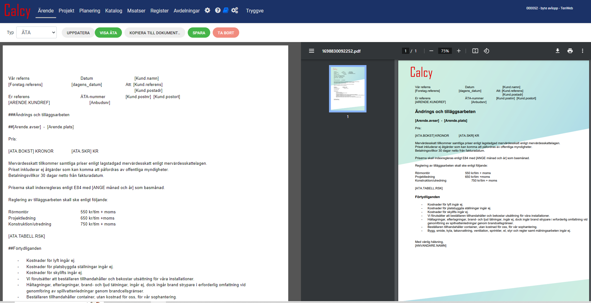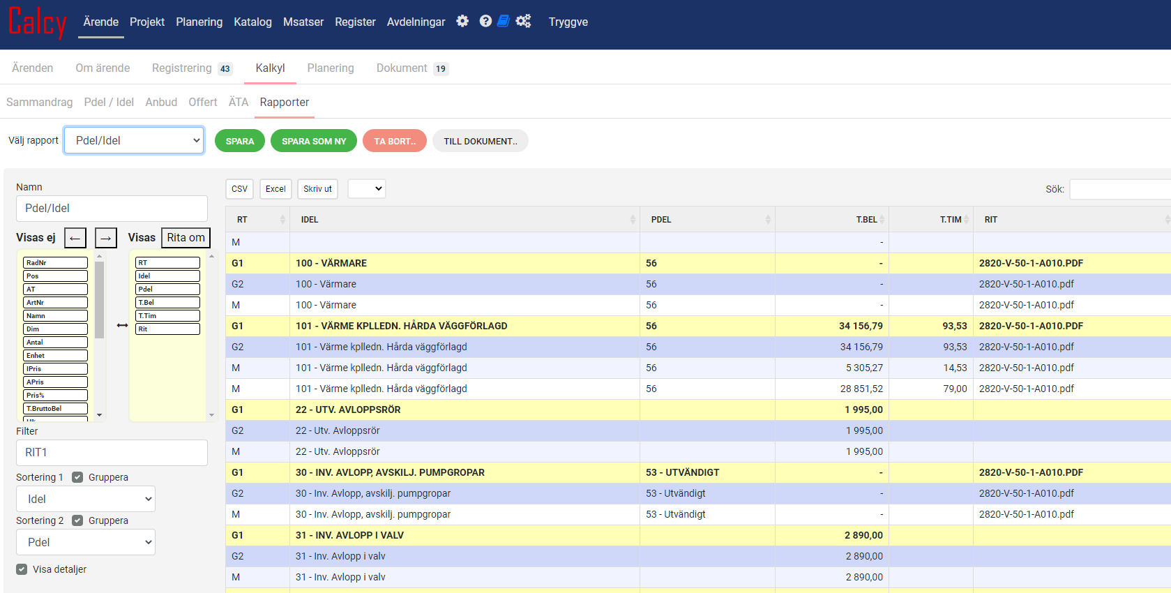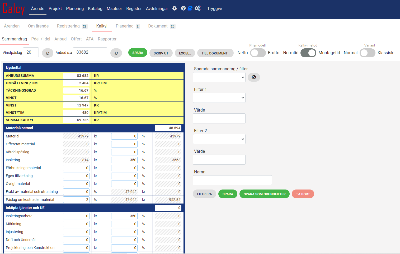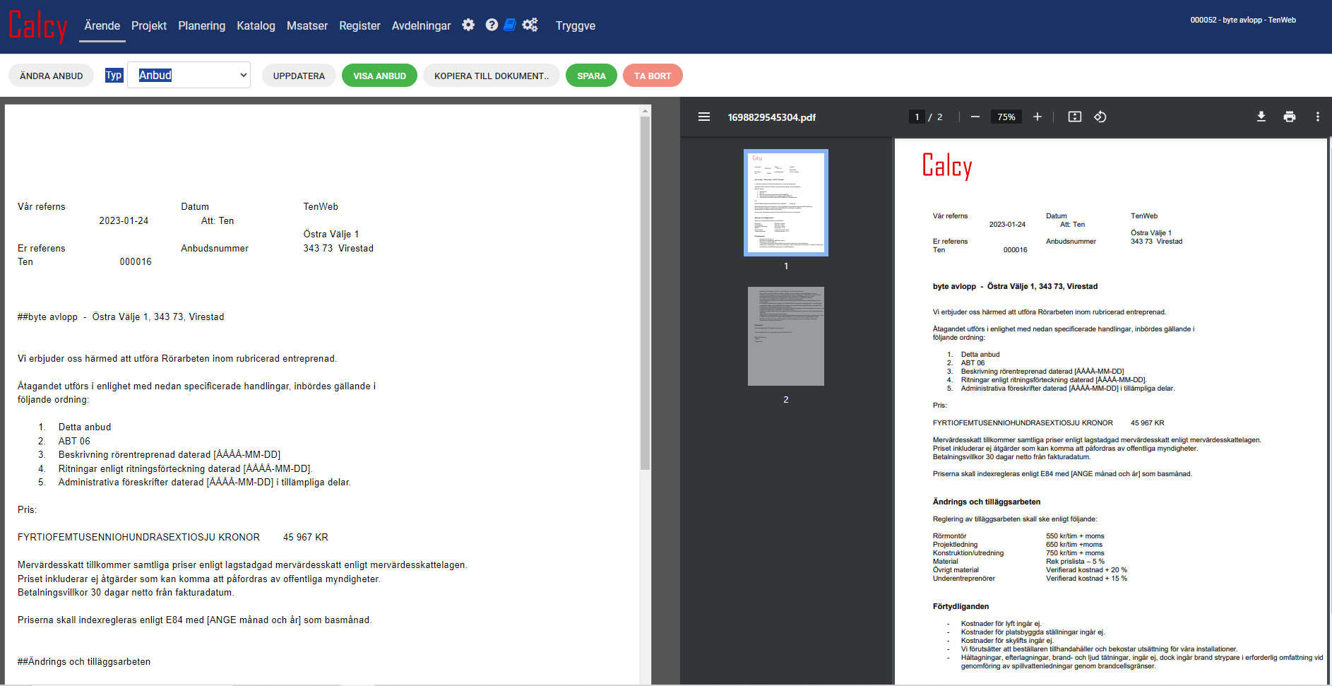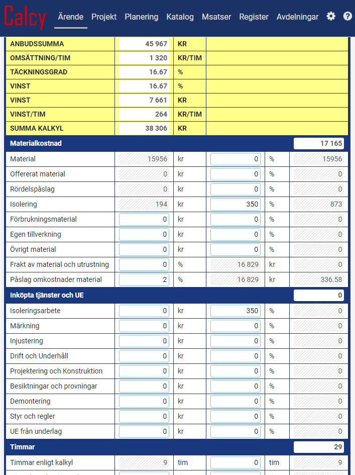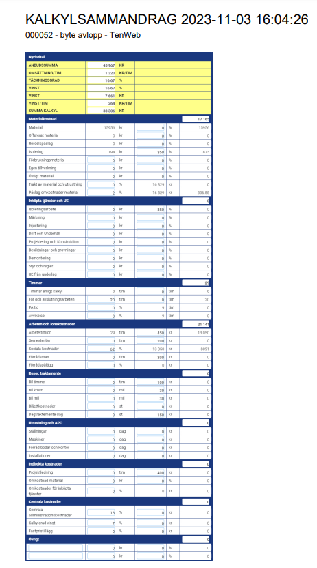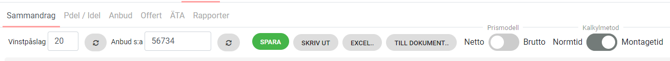 Resultatet blir bl.a ett Kalkylsammandrag, ett Anbud eller en Offert.