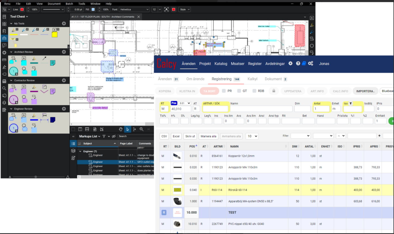 Det kanske mest avancerade är import från Bluebeam, där uppgifterna plockas direkt från dina ritningar.