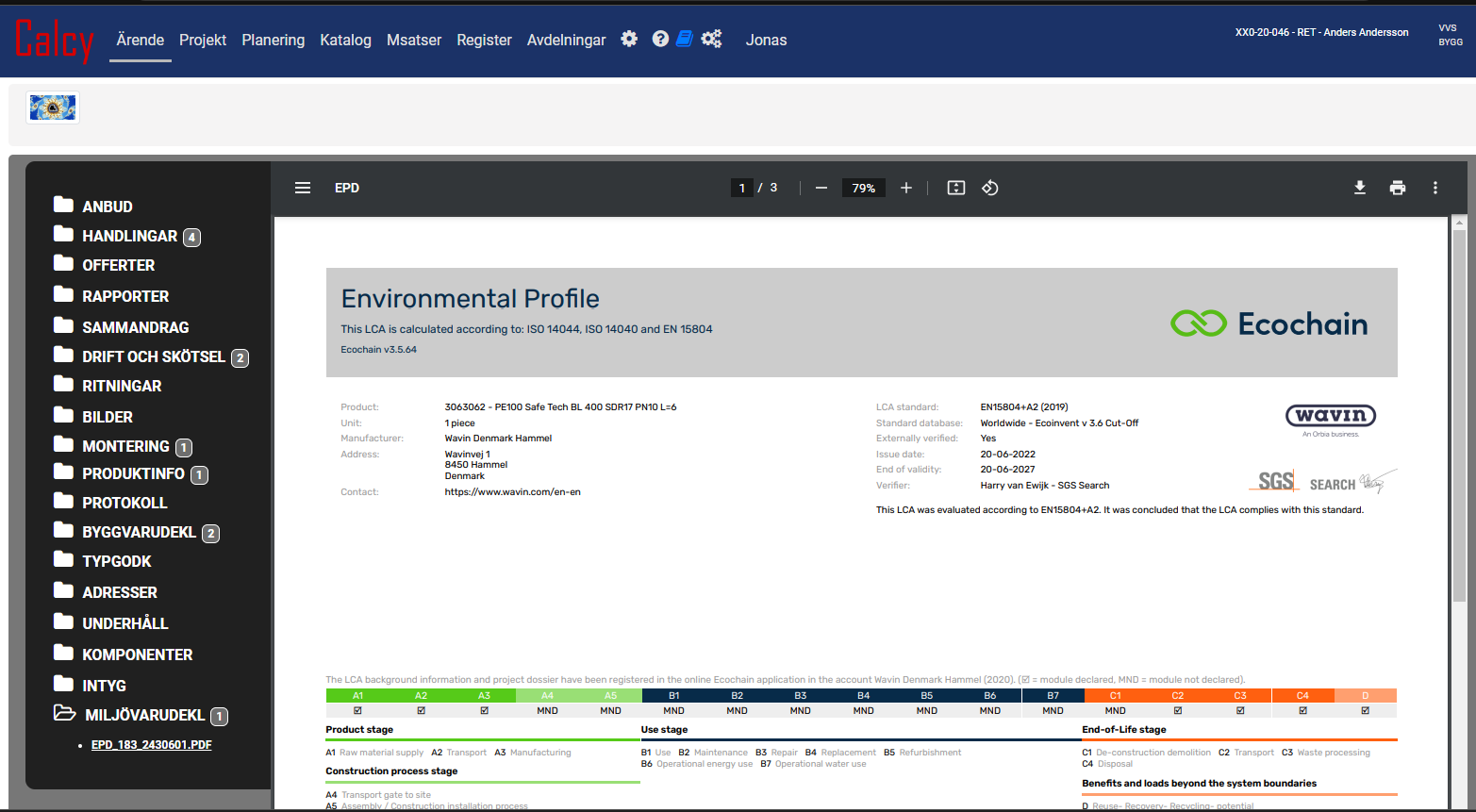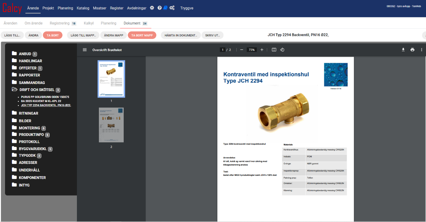 Nyhet i CALCY är att Produkters miljödeklarationer(EPD:er) numera plockas upp med automatik från RSK-katalogen och läggs i Dokument.