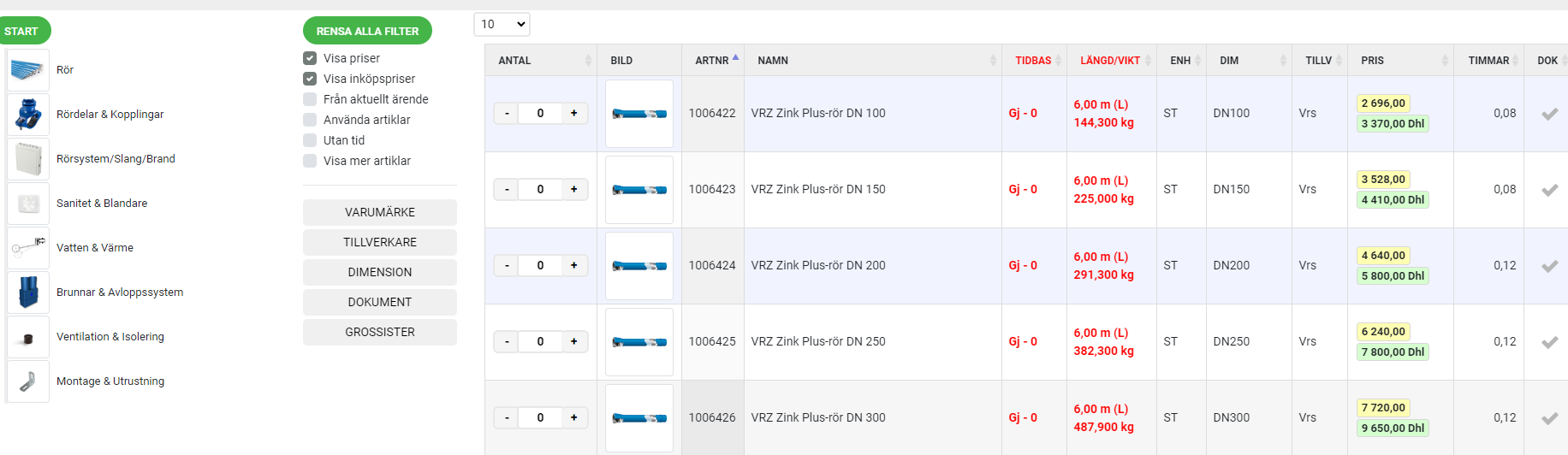 Dessutom är produkterna kopplade till samtliga inlästa prislistor.