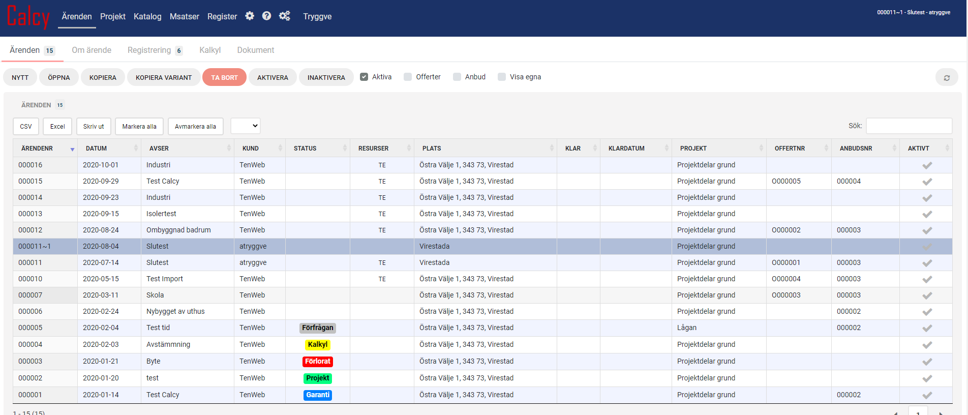 Alla objekt hanteras som Ärenden. Dessa kan man sätta Status på och följa genom hela projektfasen.
